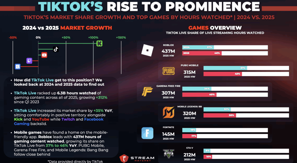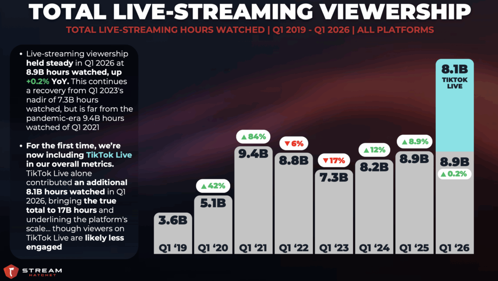 Stream Hatchet now officially includes TikTok Live data for every quarter. And in Q1 2026, TikTok Live accounted for almost half of all live-streaming viewership… though it did drop while other platforms rose from Q4 2025