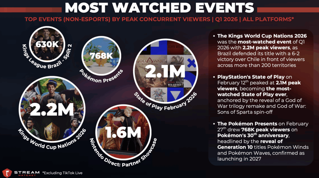 The events bringing in the most viewership included the Kings League World Cup Nations with a massive 2.2M peak viewers and game showcases like Sony’s State of Play for February with a 2.1M peak