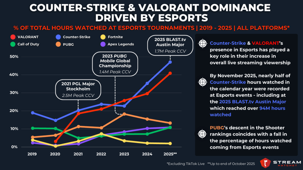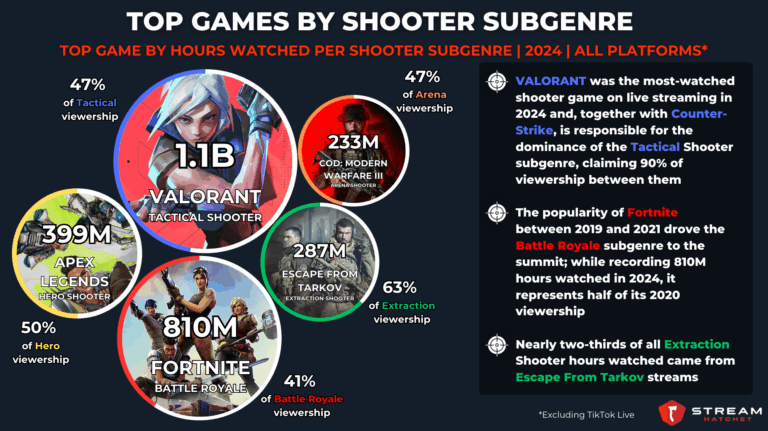 In 2023, Tactical Shooters dethroned Battle Royale games as the most-watched Shooter sub-genre on live streaming