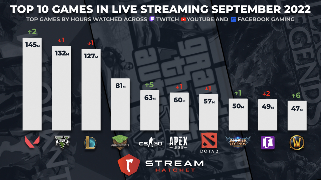 For the first time since May of this year, GTA V was knocked out of the top games in live streaming spot. The open-world game was replaced by VALORANT, which had 145 million hours watched last month, jumping from 3rd to 1st place.