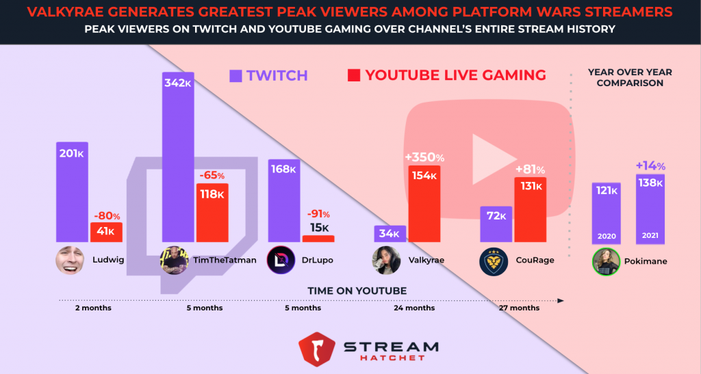 - Valkyrae has had the highest percent increase in viewership since switching to YouTube Gaming; she has hit a peak CCV of 154,000, a 350% increase from her time on Twitch.