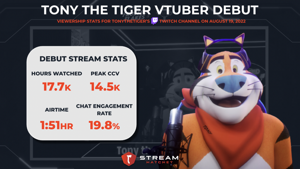 Kellogg’s might have been one of the first Western brands to attempt VTubing, and they saw some pretty good success. 20% of unique registered viewers chatting during the August 19th live stream shows that fans were engaged in the content and interested in chatting with the streamer. During the stream, Tony asked chat questions and responded to theirs, giving shoutouts with his famous “Grrrrr-reat” tagline.